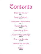 • Chapters include: Dips for Dinner; Snacky Salads; Random Sandwiches; Totally Toasts; Pizza-Type Stuff; Assorted Egg Things; Crunchy Snacks; and Sweets for Supper.